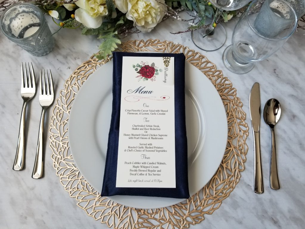 MENU’S: Menu’s have become increasingly popular to provide at each guest dinner setting. They provide your guests with a list of items to be served during meal time.