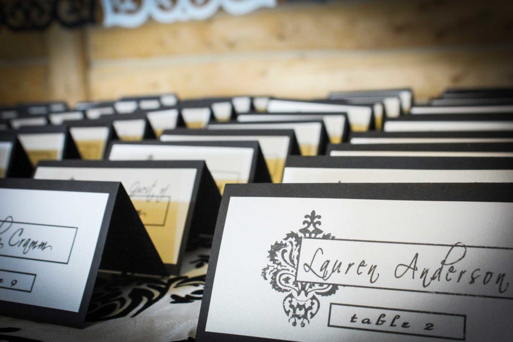 PLACE CARDS: These cards (usually paper but trending other materials are now being used) indicate a specific seat at which that guest should sit. These are usually placed at in center or top of plate. These are also called ESCORT Cards when placed in lieu of a Seating Chart at the front entrance of a reception.